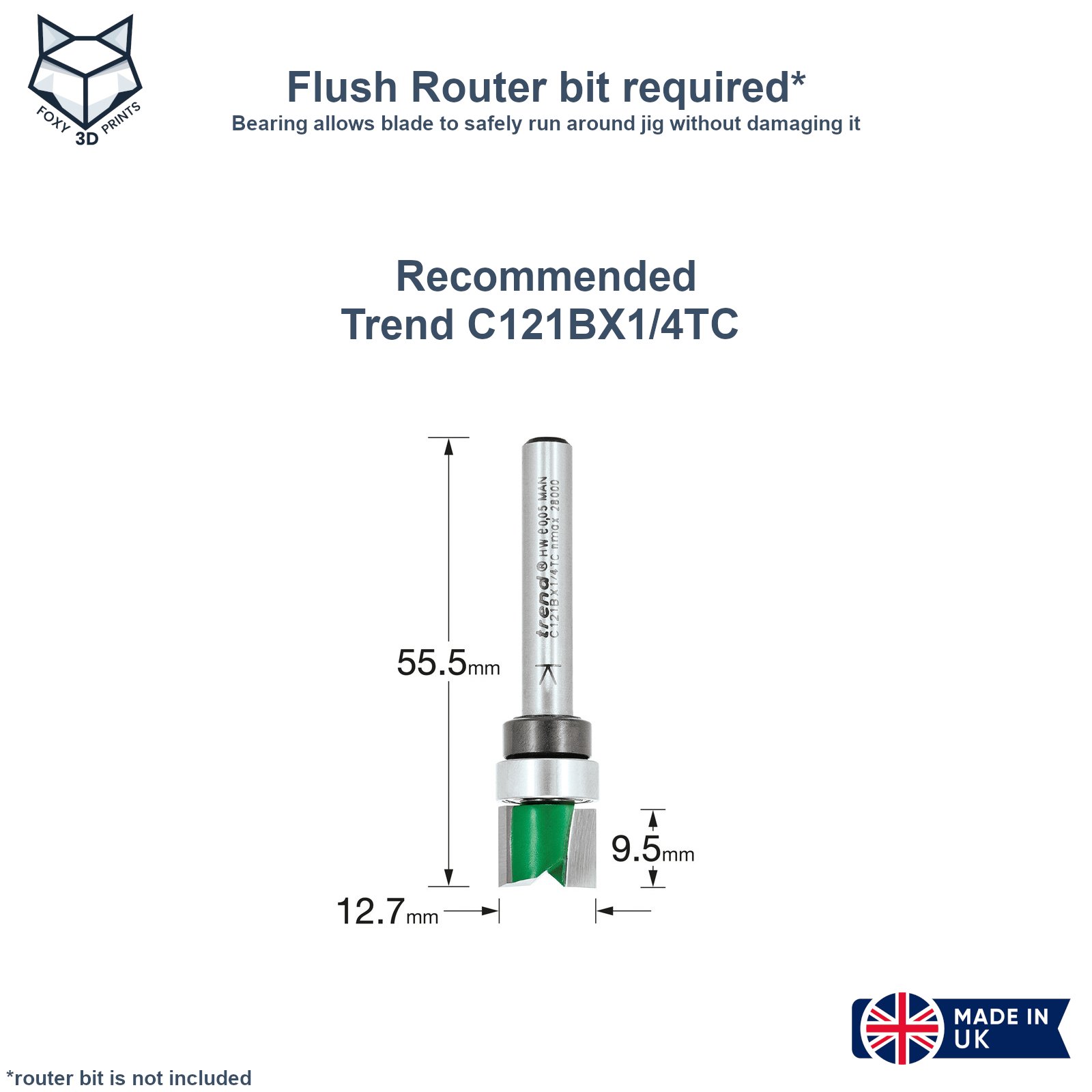 Designed to be used with a guided template profiler router bit up to 15mm in diameter. This sort of bit has a bearing that allows the blade to run around the guide without cutting it, I recommend the Trend 1/4″ 12.7mm x 9.5mm C121BX1/4TC (Toolstation code 41051). The router bit is not included.