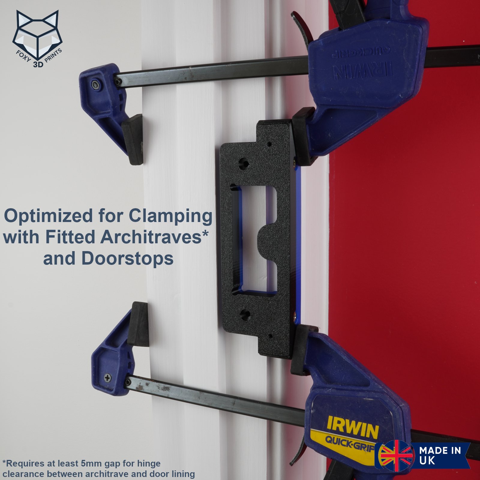 - 76 x 51 mm (blue) – For UK standard 76 x 51 mm (3 inch) hinges, recess size 76mm x 19mm, integrated 2mm cut-out depth set, the two jigs can be secured together with two of the provided screws and hung using the storage hook included
