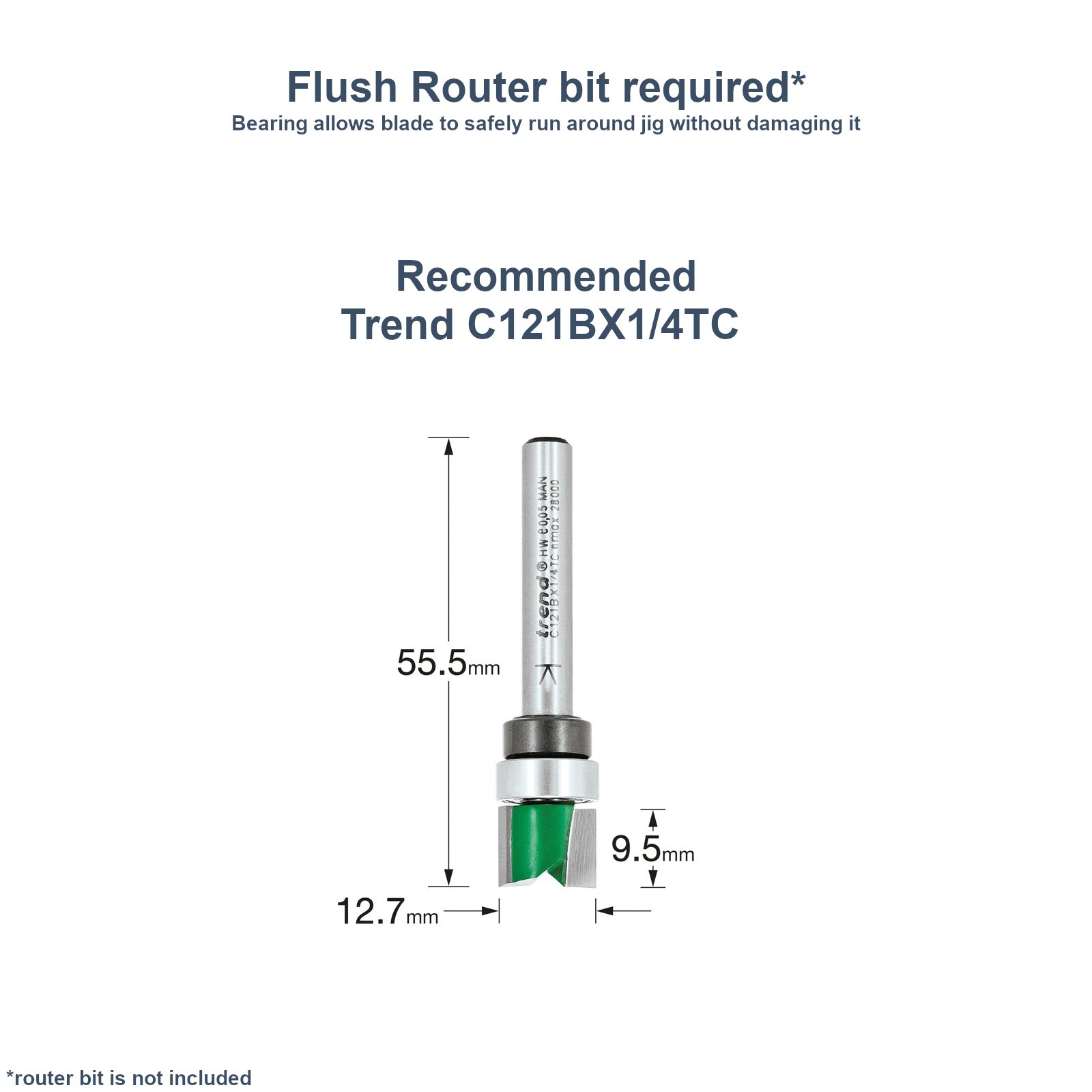 Designed to be used with a guided template profiler router bit up to 15mm in diameter. This sort of bit has a bearing that allows the blade to run around the guide without cutting it, I recommend the Trend 1/4″ 12.7mm x 9.5mm C121BX1/4TC (Toolstation code 41051). The router bit is not included.